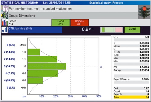 BAR RISE DELTA BAR: E' l'oscillazione locale su ogni singola lama. Vengono calcolate tutte le oscillazioni e la maggiore è visualizzata. La tolleranza tipica è 5 µm. Il valore è legato in particolare allo stato di usura dell'utensile del tornio e allerta quando un riattrezzamento si rende necessario. |